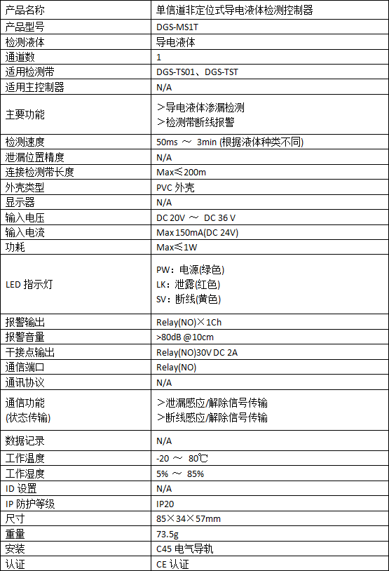 产品介绍:DGS-MS1T单信道非定位式导电液体检测控制器用于检测导电液体。它具备一组检测通道,当其与DOGOST的非定位式导电液体感应带(DGS-TS01)、窄式非定位式导电液体感应带(DGS-TST)连接后,DGS-MS1T就可以检测到感应带上存在的几乎任何导电液体、酸碱液等,在短短几秒钟内,发出声光报警,并通过Relay接口将信号上传给平台系统或设备。DGS-MS1T可以连接1条连续 长达200米(可分段跳接)的感应带,非常适合单个区域的本地漏液检测。该系统常见应用于包括原料室、设备房、机房、空调房和其它重要的区域。 DGS-MS1T提供了一个经济可靠的漏液检测解决方案,可以减轻液体泄漏的潜在损失,降低业务成本和故障的时间。技术参数: