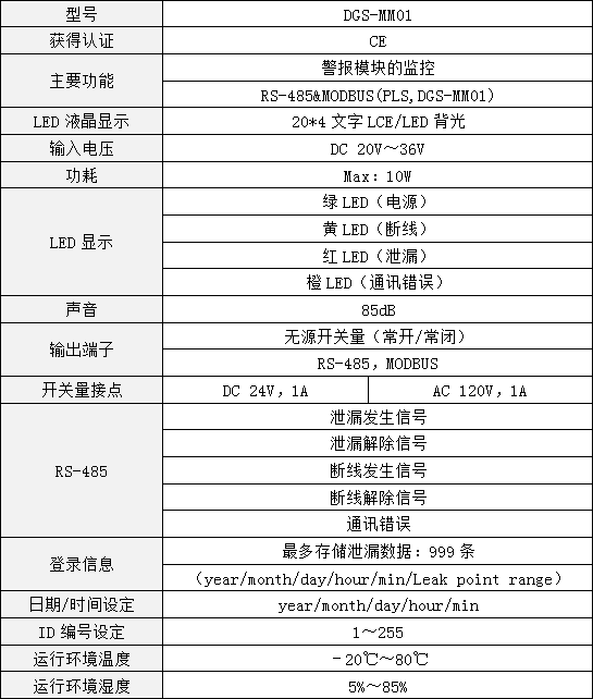 产品介绍:DGS-MM01主控制器可以用一种独特的方式对 多达到32台子检测控制器进行控制,也就是说它可以同时接受 多32个不同地址的信息采集。当其与子控制器连接后,就可以监测到子控制器上发出声光报警和断线信息,并通过Relay及485接口将数据信号上传给平台系统。主控制器本身可保存 多999条报警记录信息。DGS-MM01具备RS485接口,通过 长达1200米的通信线缆,可以很容易的把所有子控制器整合一起,并传输到业主现有的建筑管理系统(BMS)或者网络管理系统(NMS)。 当然也可以与DOGOST的DGS-SW01漏液监控报警平台连接,在线实时的上传汇总控制器的所有状态、警报信息,并以各种图文表格的形式显示到中央监控主机的显示器上。 技术参数:
